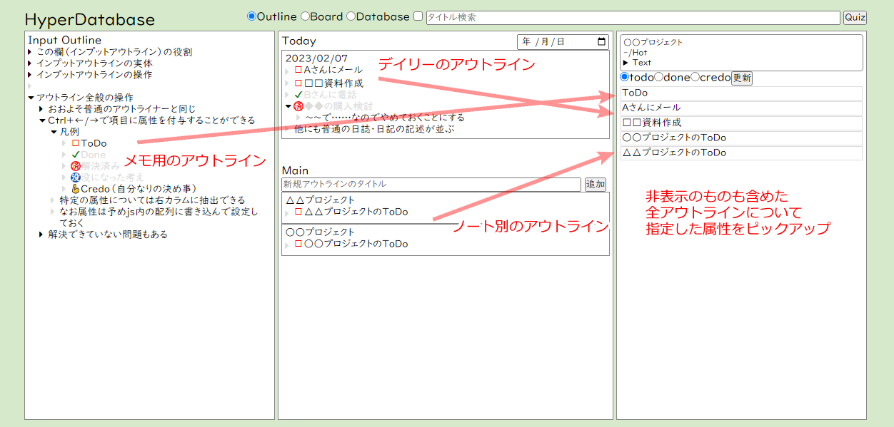 場としては自作のアウトライナーになるのですが、俯瞰のために行われていることとしてはLogseqでのQueryを使ったToDo管理と同じようなものになっています。つまり、デイリー欄やプロジェクト毎の欄などあちこちにToDo属性を付けたノードがあり、それをまとめて取得して表示できる状態です。