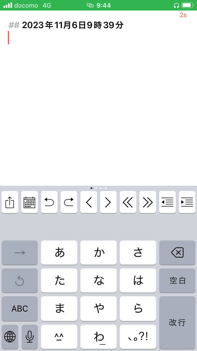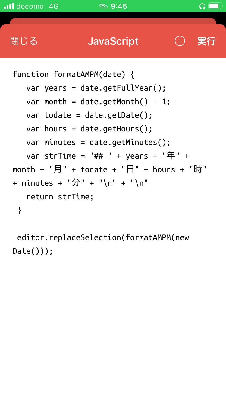 これでOKです。あとはメニューバーに追加されているこのアクション用のボタンをタップすれば、カーソル位置にタイムスタンプ挿入されます。私の場合は、マークダウンの見出しにしたかったので、## を付けてますが不要ならコードから取り除けばOKです。