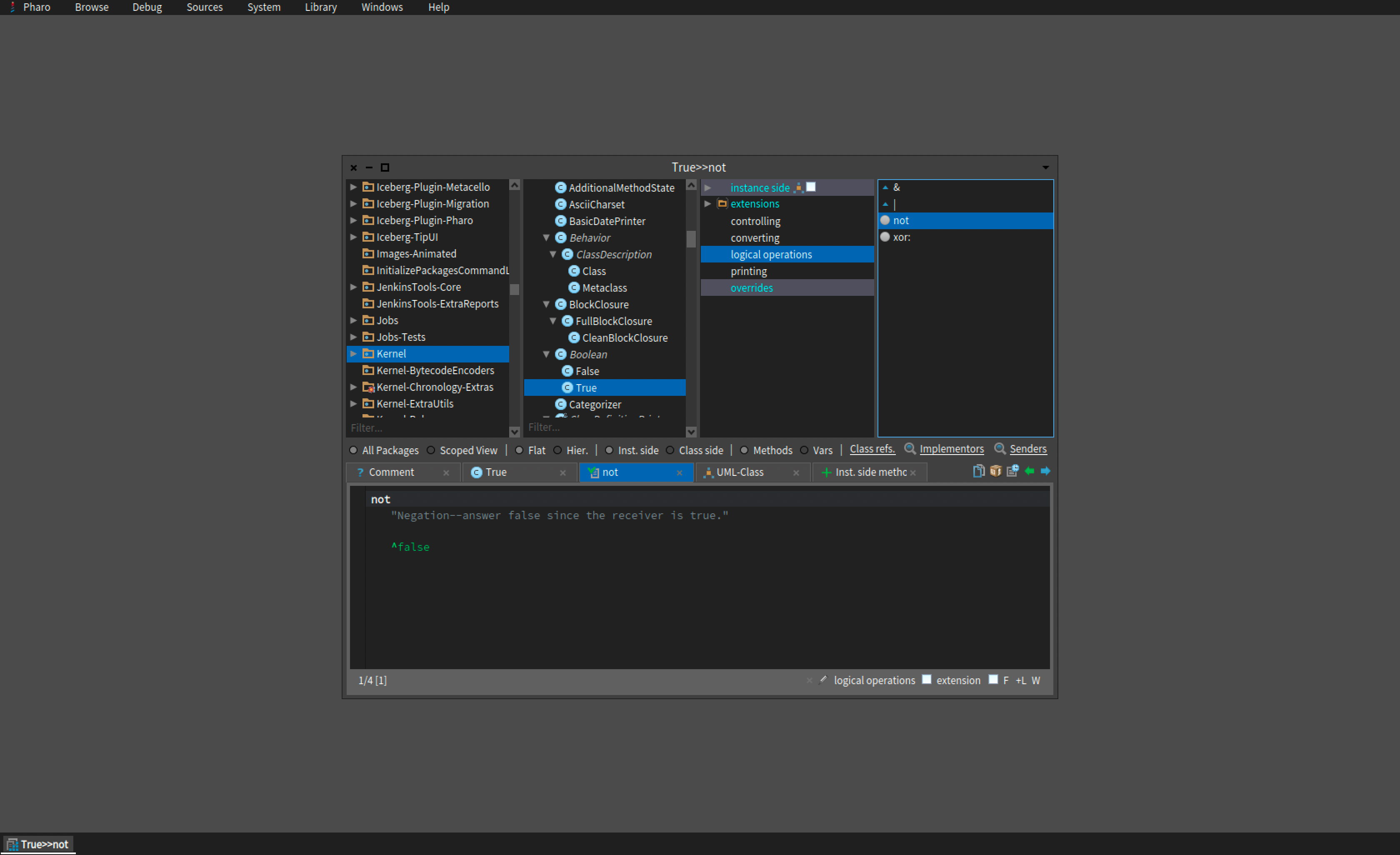 この画面すべてがPharoの世界。デスクトップもシステムブラウザも、ここに見えていませんがテキストエディタや他の窓も、窓の中のものもすべて、Pharoが用意したものです。もちろん、デスクトップやシステムブラウザ、それ以外の窓の見かけだけでなく、機能を変えることもできます。